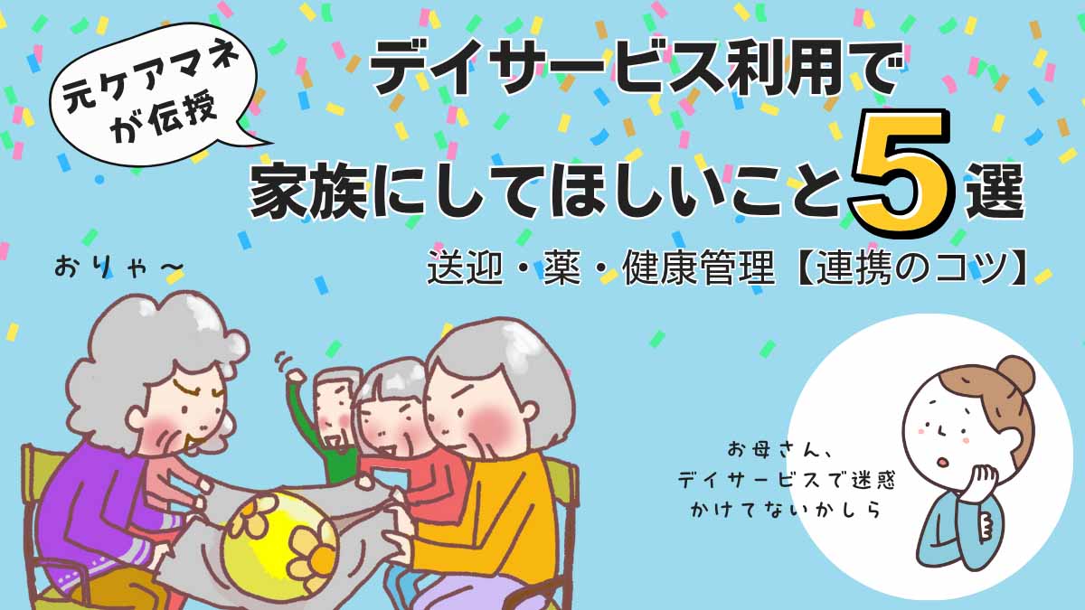 デイサービスの送迎や情報共有に悩む家族必見。元ケアマネが、送迎や薬、服装など、家族が押さえるべき5つのポイントとコミュニケーションのコツを解説。