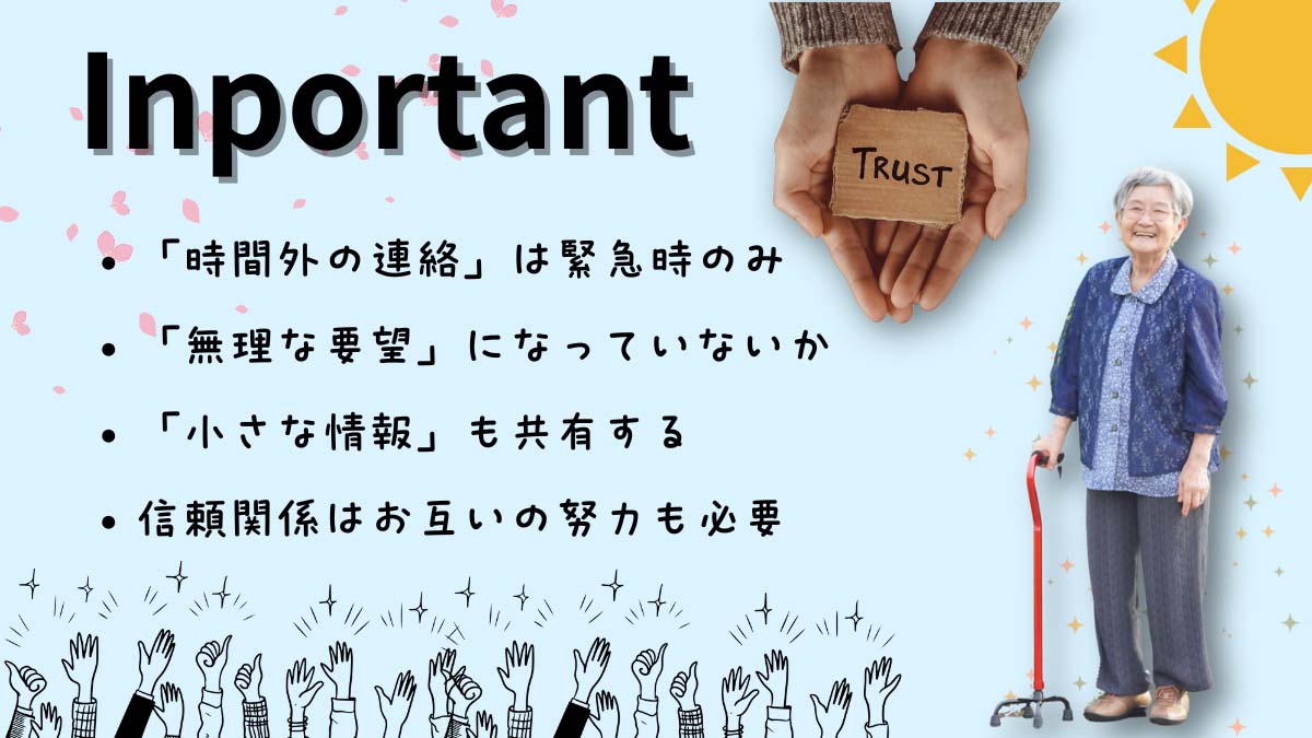 信頼関係は、ケアマネジャー側の努力だけでなく、お互いの配慮によって築かれるものです。新しい担当者と良い関係を長く続けるために、介護者として以下の点も意識してみましょう。